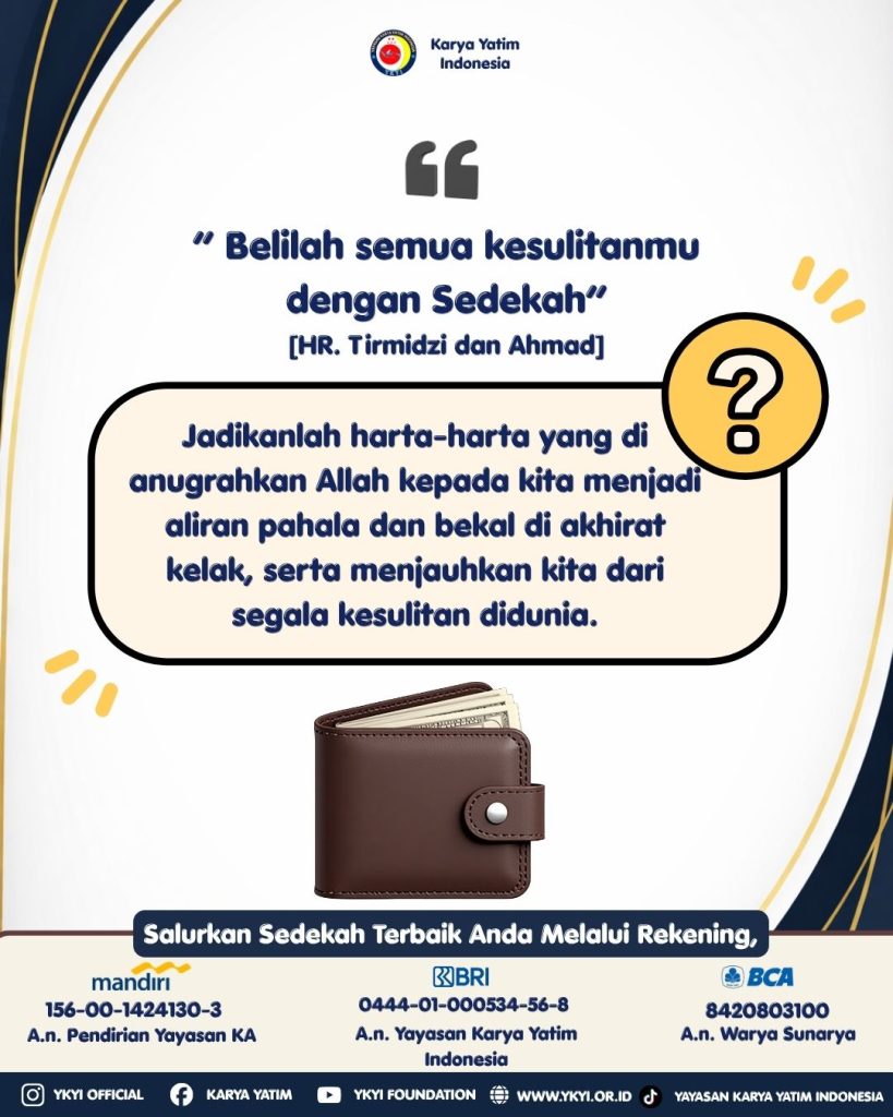 “Belilah semua kesulitanmu dengan sedekah.” (HR. Tirmidzi dan Ahmad)