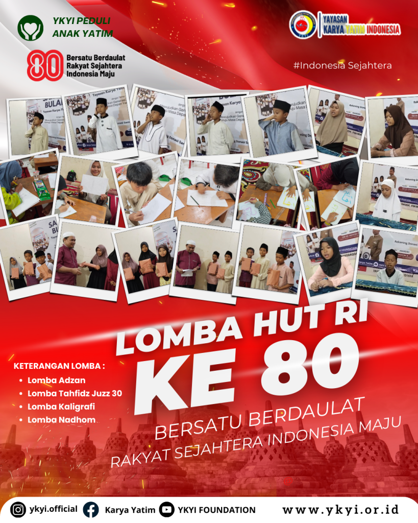 Di momen HUT RI ke-80, anak-anak yatim menunjukkan semangat lewat lomba adzan, tahfidz, kaligrafi, dan nadhom.