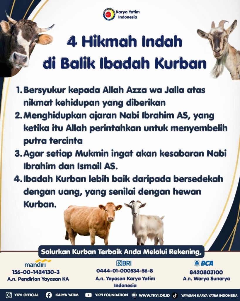 Qurban mengajarkan kita untuk ikhlas dalam memberi dan sabar dalam menjalankan perintah Allah, sebagaimana kesabaran Nabi Ibrahim dan Ismail AS.