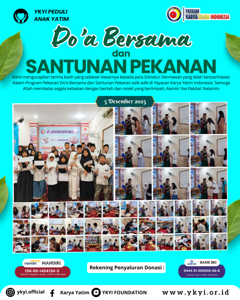#YKYIPeduli #SantunanPekanan #DoaBersama #SedekahMembahagiakan #AnakYatim #GerakanKebaikan #DonasiYatim #YayasanKaryaYatimIndonesia