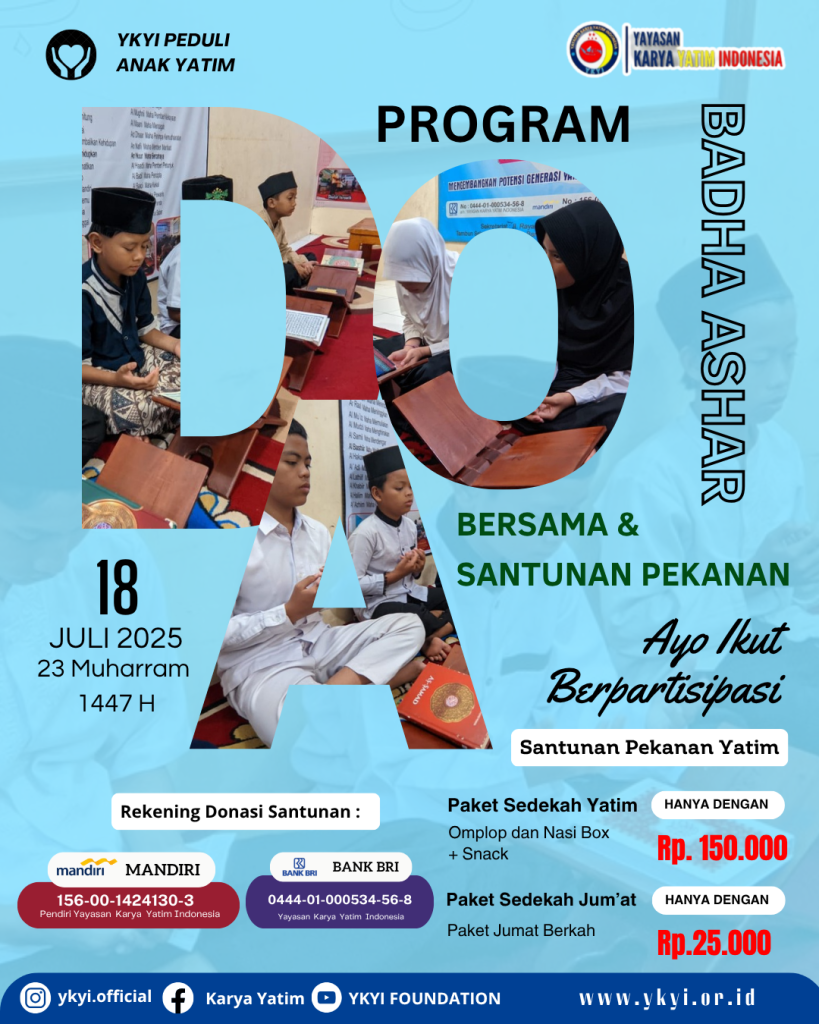 Dalam rangka memperkuat keimanan dan kepedulian sosial, YKYI kembali menggelar Program Doa Badha Ashar & Santunan Pekanan. Kegiatan ini menjadi ruang berbagi kebahagiaan bersama anak-anak yatim, sekaligus mengajak para dermawan untuk berpartisipasi dalam amal jariyah.